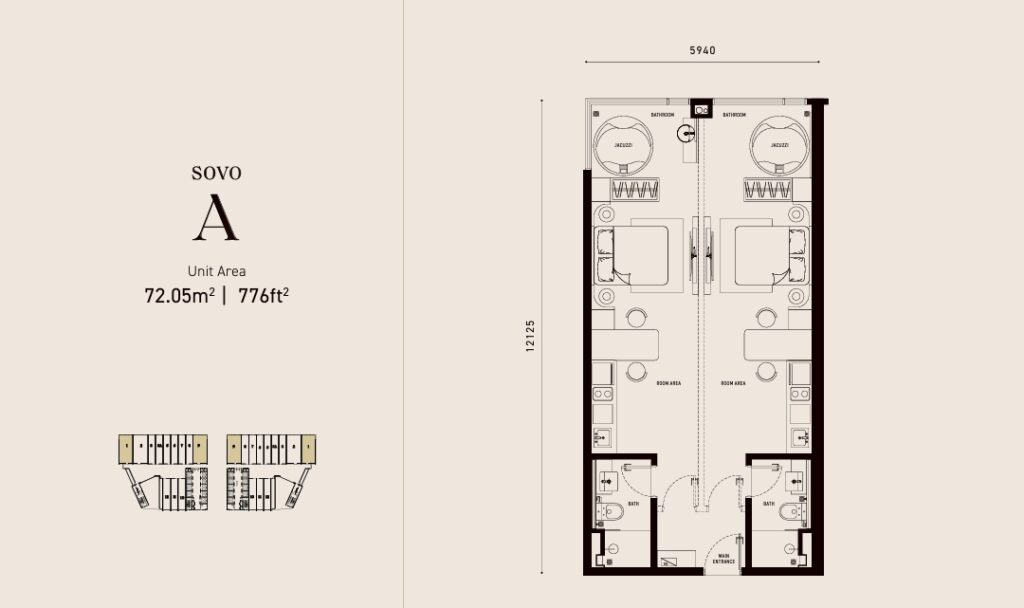 The SoHo units range from 538 to 558 sq ft, while the SoVo units range from 406 to 1,182 sq ft.