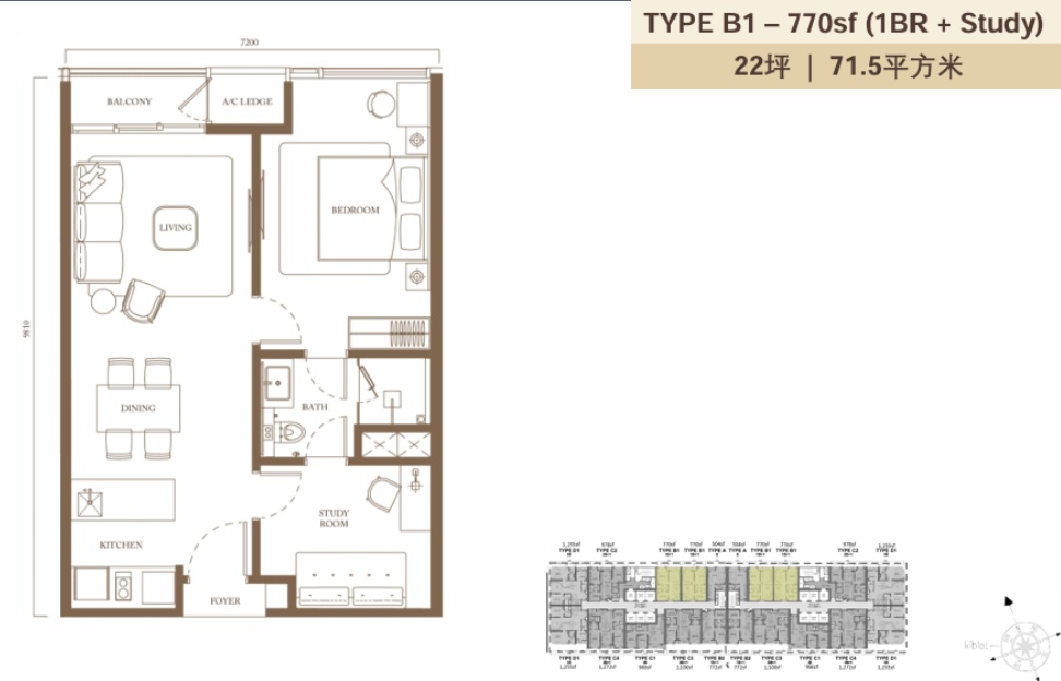 Type B1 : 770 sq ft2 bedrooms + study, 1 bathroom