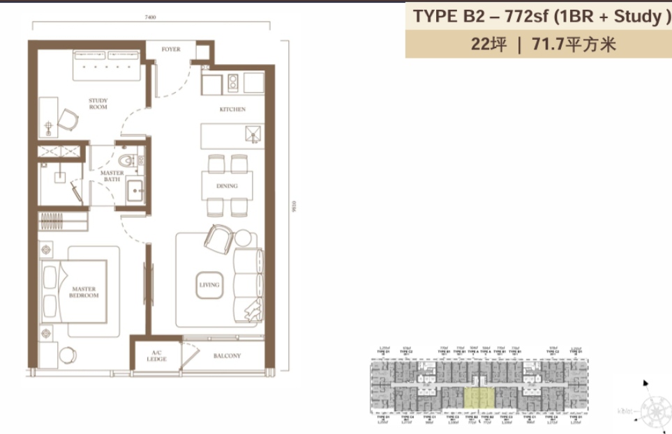 Type B2 : 772 sq ft2 bedrooms + study, 1 bathroom