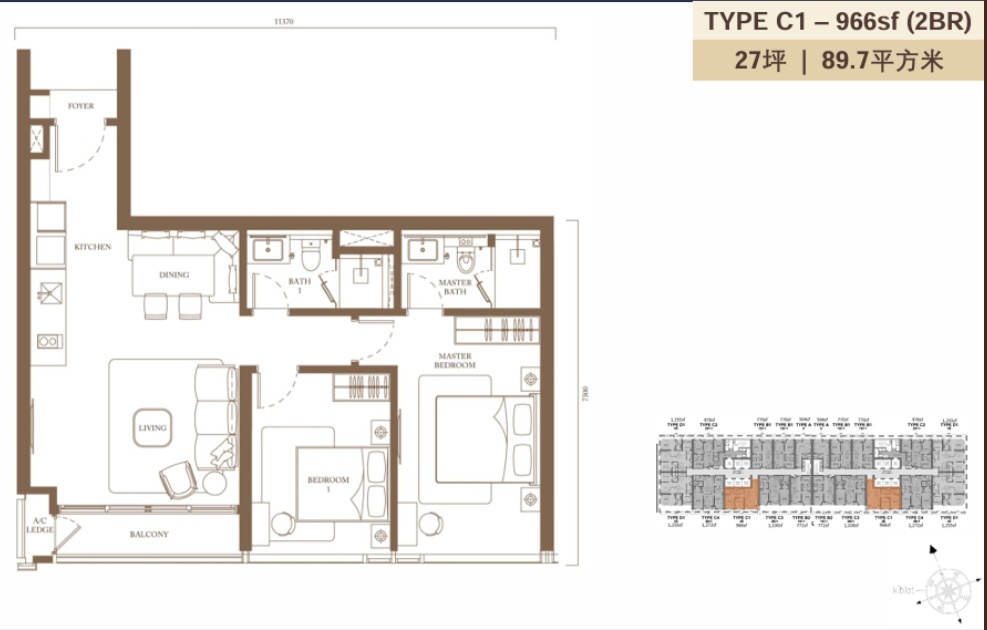 Type C2 : 966 sq ft2 bedrooms, 2 bathrooms