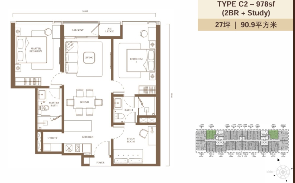 Type C2 : 978 sq ft2 bedrooms + study, 2 bathrooms