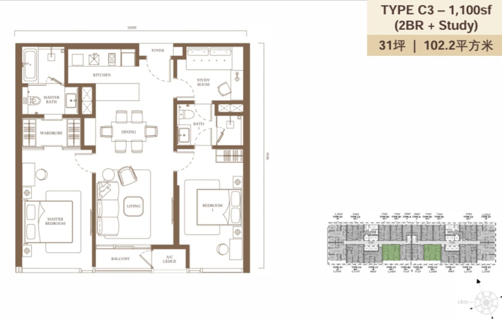 Type C3 : 1,100 sq ft2 bedrooms + study, 2 bathrooms