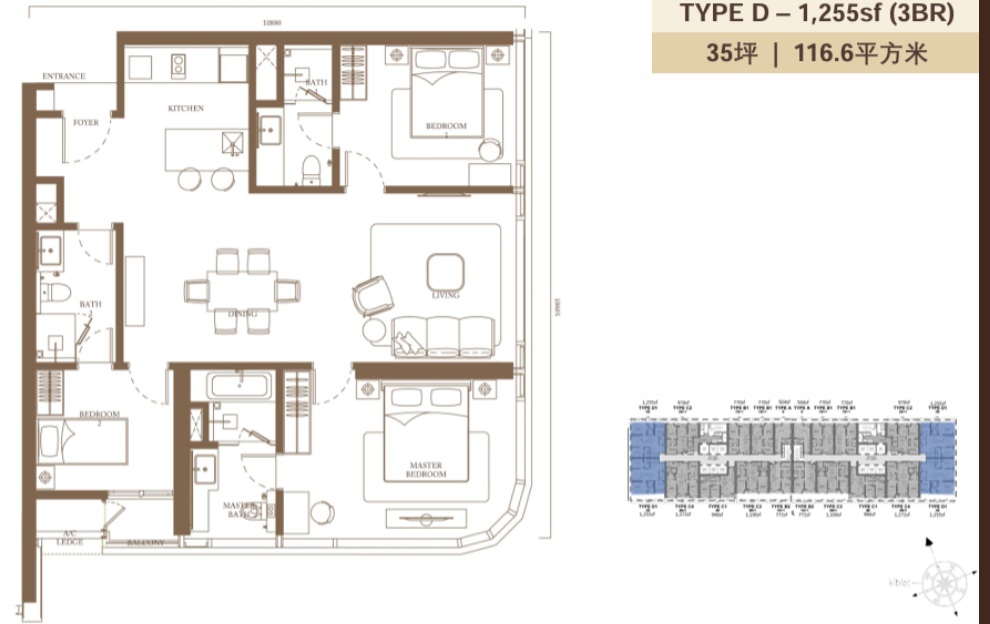 Type D : 1,255 sq ft3 bedrooms, 3 bathrooms